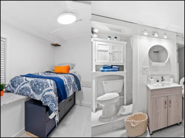 اس غسل خانے کی اندرونی تصاویر میں آرام دہ بستر بھی ہے جس کے نچلے حصے میں درازیں موجود ہیں۔ (تصاویر: سوشل میڈیا)