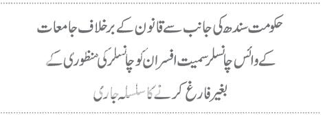 حکومت سندھ کی جانب سے قانون کے برخلاف جامعات کے وائس چانسلرسمیت افسران کوچانسلر کی منظوری کےبغیرفارغ کرنے کاسلسلہ جاری