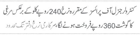 کنٹرولر جنرل آف پرائسزکے مقررہ نرخ240 روپے کلوکے برعکس مرغی کاگوشت360 روپے فروخت ہونے لگا،سرکاری نرخ دفترتک محدود