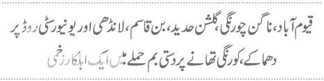 ناگن چورنگی ، گلشن حدید ، بن قاسم ، لانڈھی اور یونیورسٹی روڈ پر دھماکے،کورنگی تھانے پردستی بم حملے میں ایک اہلکار زخمی
