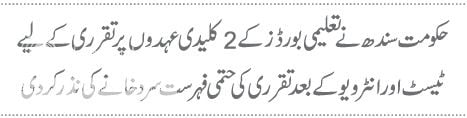 سندھ کے تعلیمی بورڈز میں اہم عہدوں پر تعیناتی کا عمل غیراعلانیہ طور پرروک دیاگیا ہے اور20 روز قبل تعلیمی بورڈز میں2 کلیدی عہدوں پر تقرری کے سلسلے میں لیے گئے ٹیسٹ اورانٹرویو کے بعد حتمی فہرست میں شامل افرادکی تقرریوں کی سمری سرد خانے کی نذرکردی گئی ہے۔