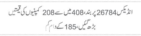 انڈیکس 26 ہزار784 پر بند، 408 میں سے208 کمپنیوں کی قیمتیں بڑھ گئیں،185 کمپنیوں کے دام کم ہوگئے
