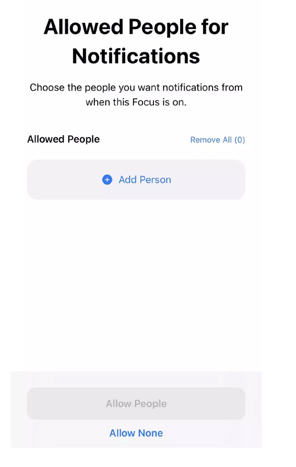 کسٹم فوکس موڈ تخلیق کرنے کے لیے '+' بٹن ٹیپ کر کے Custom کو منتخب کریں۔ اس کے بعد اسے کوئی نام دے کر رنگ اور آئیکون منتخب کریں۔ اس کے بعد آپ کو اپنی فون بک میں موجود ان افراد کو منتخب کرنا ہے، جنہیں آپ چاہتے ہوں کہ وہ فوکس موڈ آن ہوتے ہوئے بھی آپ کے نوٹیفیکیشن موصول کر سکیں۔