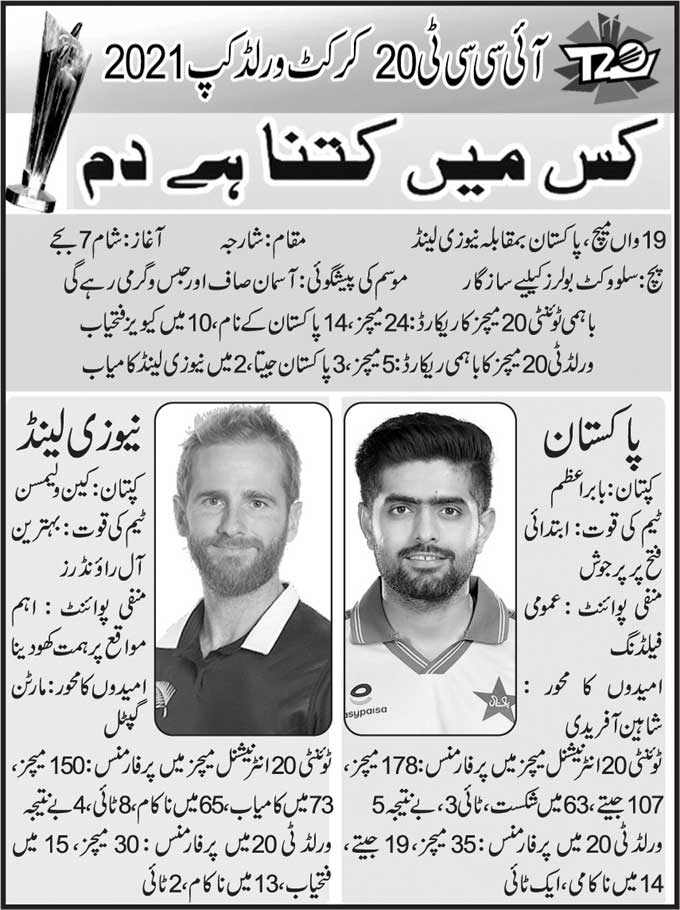 دوسری جانب نیوزی لینڈ کی ٹیم حالیہ فارم کی وجہ سے پریشان ہے، وارم اپ میچز میں اسے آسٹریلیا اور انگلینڈ دونوں سے شکستوں کا سامنا کرنا پڑا، کپتان کین ولیمسن کی فارم بھی ٹیم مینجمنٹ کے لیے باعث تشویش ہے،انھوں نے کینگروز سے میچ میں بیٹنگ بھی نہیں کی تھی،نیوزی لینڈ کے پاس بہترین بولنگ اٹیک موجود مگر ان کے بیٹرز کو ذمہ داری کا مظاپرہ کرنا ہوگا،مارٹن گپٹل بیٹنگ لائن میں ٹیم کے لیے اہم ستون ثابت ہو سکتے ہیں، آئی سی سی ایونٹس میں عموما کیویز کی کارکردگی اچھی رہتی ہے، اس بار بھی انھیں نظرانداز نہیں کیا جا سکتا۔