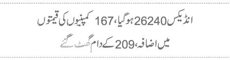 انڈیکس 26 ہزار 240 کی سطح پر آگیا، 167 کمپنیوں کی قیمتوں میں اضافہ اور 209 کے دام گھٹ گئے