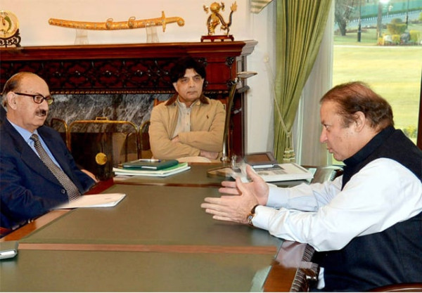 وفاقی وزیر داخلہ چوہدری نثار علی خان بھی وزیراعظم اور عرفان صدیقی کے درمیان ملاقات کے موقع پر موجود تھے۔ فوٹو: پی آئی ڈی