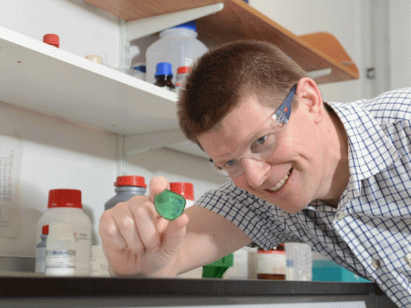 ایسٹن یونیورسٹی کے ڈاکٹر رچرڈ مارٹن 100 گنا طاقتور بیکٹیریا کش شیشے کے ساتھ اپنی تجربہ گاہ میں مسرور دکھائی دے رہے ہیں۔ فوٹو: ایسٹن یونیورسٹی