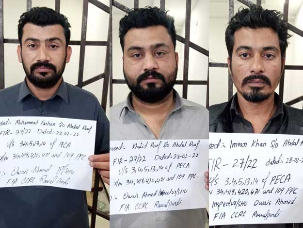 ملزمان میں محمد فرحان، خالد روف، اور عمران شامل ہیں، ایف آئی اے