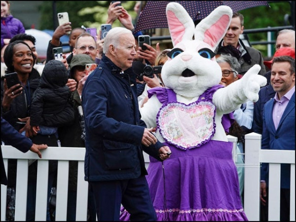 بائیڈن نے اس سوال کا جواب دینا شروع کیا ہی تھا کہ ایسٹر بنی (ایسٹر خرگوش) کے بھیس میں ایک نامعلوم شخص تیزی سے وہاں آ پہنچا اور ''ایسٹر بنی آگیا ہے!'' کا نعرہ بلند کرتے ہوئے، امریکی صدر کو دوسری طرف چلنے کا اشارہ کیا۔