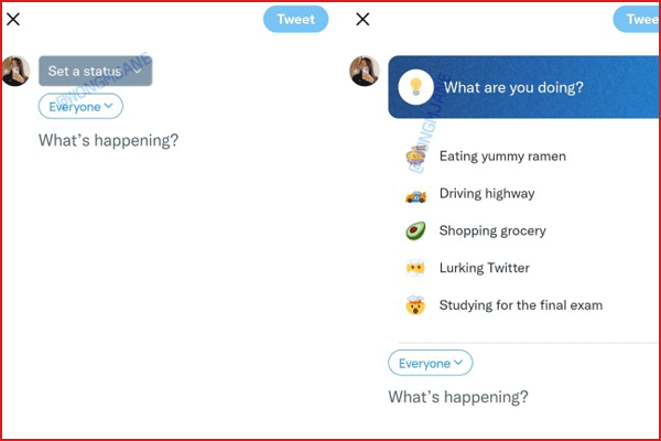 اس کا سب سے پہلے اشارہ ایک ایپ تجزیہ کار اور محقق جین وونگ نے کیا ہے اور انہوں نے اسے ٹویٹ بھی کیا ہے۔ جین نے بتایا ہے کہ ٹویٹ کمپوزر باکس کے اوپر کمپوزر باکس میں اس کا آپشن موجود ہوگا۔ یہاں 'سیٹ اے اسٹیٹس' لکھا ملے گا جسے چھوکر اسٹیٹس سیٹ کیا جاسکتا ہے۔
