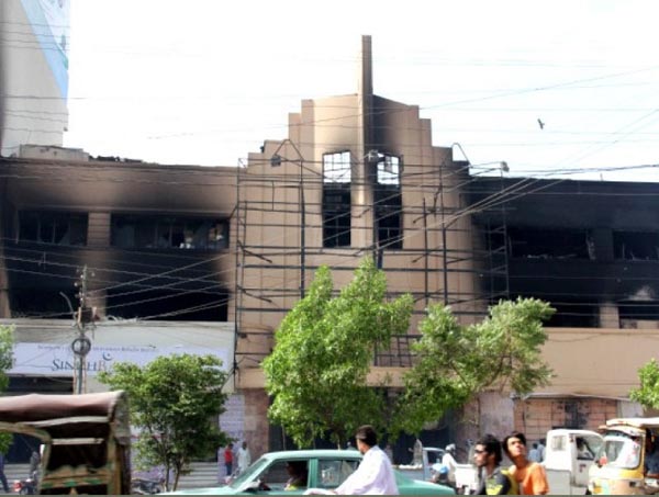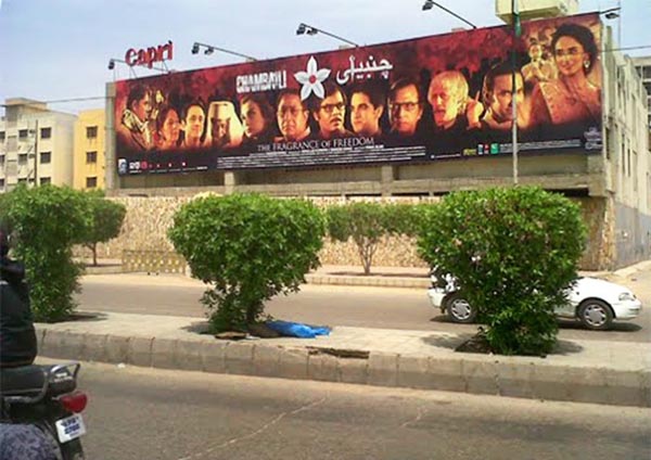 یہاں گل مہر اور نیم پر کلہاڑے چلادیے گئے۔ اس سے تھوڑا آگے نشاط سنیما کے نذر آتش ہونے کے بعد یعنی اگست 2012 کے بعد کا منظر تصویر میں اور موجود حالت دیکھ کر اندازہ لگائیں کہ نشاط سینما پر تخریب کاری کے بعد ماحولیاتی دہشت گردی بھی کی گئی ہے۔