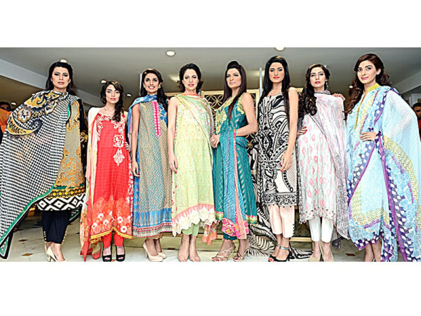 لاہور میں ہونیوالے ایک شو کے دوران سپرماڈلز لان کے دیدہ زیب پرنٹس کی نمائش کر رہی ہیں ۔ فوٹو : ایکسپریس