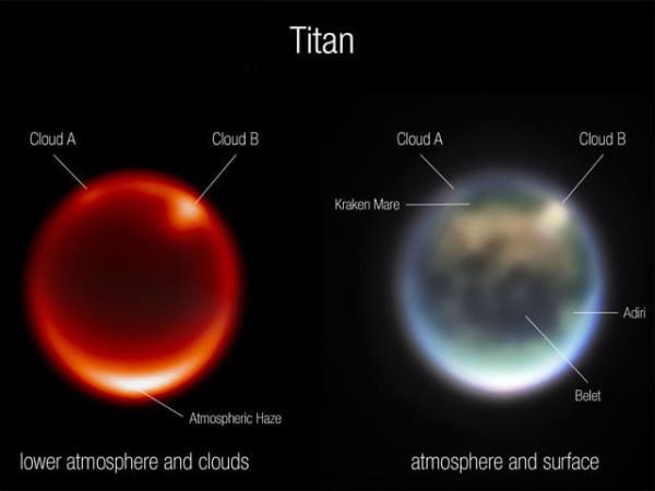 جمعرات کے روز ماہرینِ فلکیات نے اعلان کیا کہ ٹیلی اسکوپ نے ٹائٹن کے شمالی ہیمسفیئر میں روشن نشانات کی نشان دہی کی جو دراصل بڑے بادل ہیں۔ یہ چیز کمپیوٹر ماڈل کی ان پیش گوئیوں کی تصدیق کرتی ہے کہ بادل موسمِ گرما کے آخر میں ابھرتے ہیں جب سطح گرم ہوتی ہے۔
