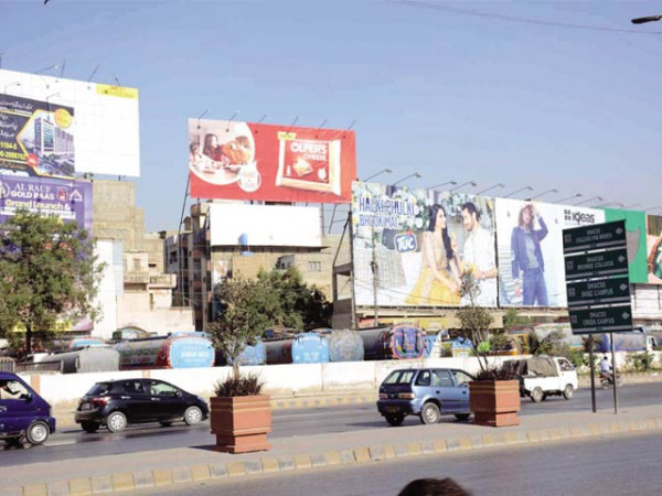 شہر کے کئی مقامات پر دیوہیکل اشتہاری بورڈ عمارتوں اور گھروں کی چھتوں پر لگادیے گئے ہیں
