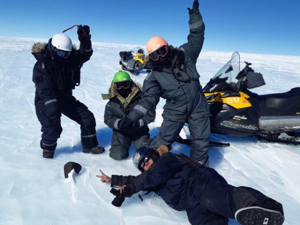 بین الاقوامی ماہرین کی ٹیم انٹارکٹیکا میں سات کلوگرام وزنی شہابی پتھر کے پاس اپنی خوشی کا اظہار کررہی ہے۔ فوٹو: بشکریہ ماریہ والدیز، جامعہ شکاگو