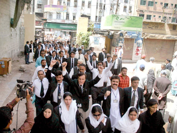 وقار الحسن شاہ ایڈووکیٹ کی ٹارگٹ کلنگ کے خلاف وکلا احتجاج کر رہے ہیں۔ فوٹو: ایکسپریس