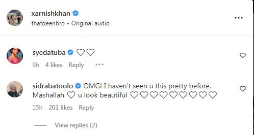حال ہی میں اسلام کے خاطر شوبز سے کنارہ کشی اختیار کرنے والی اداکارہ صدرہ بتول نے زرنش خان کی تصاویر پر پسندیدگی کا اظہار کرتے ہوئے لکھا کہ انہوں نے زرنش کو اس سے پہلے کبھی اس قدر دلکش نہیں دیکھا تھا۔