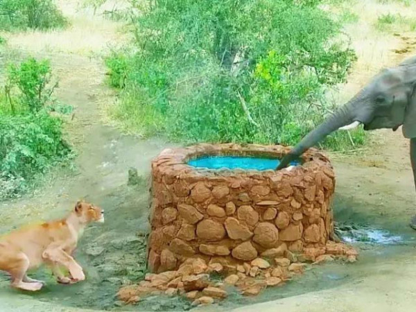 اس موقع پر شیرنی نے پیچھے ہٹنے کا ارادہ کیا لیکن ہاتھی نے پہلے پانی پیا اور اس کے بعد سونڈ میں بھر کر اسے شیرنی کی جانب پھینکا۔ اس کے بعد شیرنی نے پیچھے ہٹنے میں ہی عافیت جانی اور اور ہاتھی چنگھاڑتا ہوا اس کے پیچھے دوڑا۔
