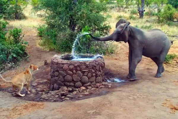 افریقی پارک میں ہاتھی نے شیرنی پر پانی پھینک کر اسے بھاگنے پر مجبور کردیا۔ فوٹو: اسکرین شاٹ بیولیل گیم ریزرو پارک