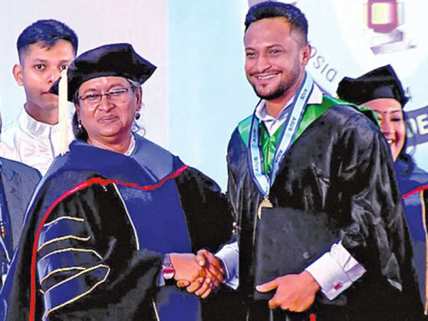 بنگلہ دیشی آل راؤنڈر شکیب الحسن نے 35 سال کی عمر میں گریجویشن ڈگری پروگرام مکمل کرلیا، انھوں نے ڈھاکا میں موجود امریکن انٹرنیشنل یونیورسٹی بنگلہ دیش سے ڈگری حاصل کی، وہ کرکٹ میدانوں اور اس سے باہر ہمیشہ شہ سرخیوں میں جگہ پاتے ہیں، اس بار تعلیم کا خواب پورا ہونے پر نمایاں ہوگئے۔