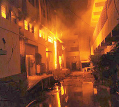 11 ستمبر 2012 کو علی انٹر پرائزز میں لگنے والی آگ کی تصویر دوسری طرف امدادی کام ہورہا ہے(فائل فوٹو)