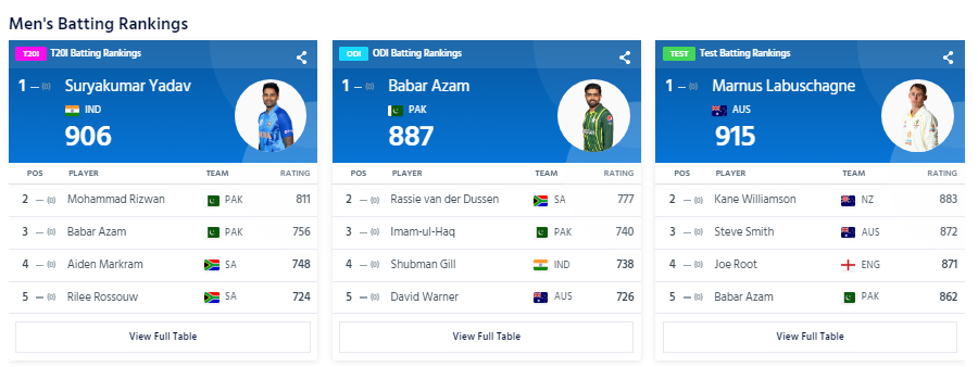 وکٹ کیپر بیٹر محمد رضوان اور بھارتی بلےباز سوریا کمار یادو کے درمیان فاصلہ 100 سے کم ریٹنگ پوائنٹس کا رہ گیا ہے۔ پاکستانی بیٹر 798 سے 811 پوائنٹس پر پہنچ کر دوسرے نمبر موجود ہیں جبکہ کپتان بابر اعظم 756 پوائنٹس کے ساتھ تیسرے نمبر پر براجمان ہیں۔
