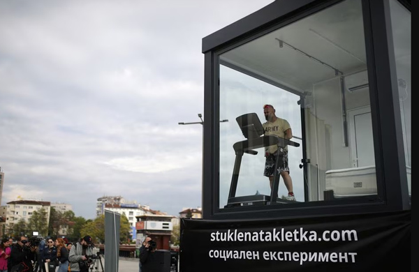 بلغاریہ کے اہم شہر سوفیا کے ایک عوامی میدان میں انہوں نے خود کو ایک شیشے کے گھر میں بند کیا ہے۔