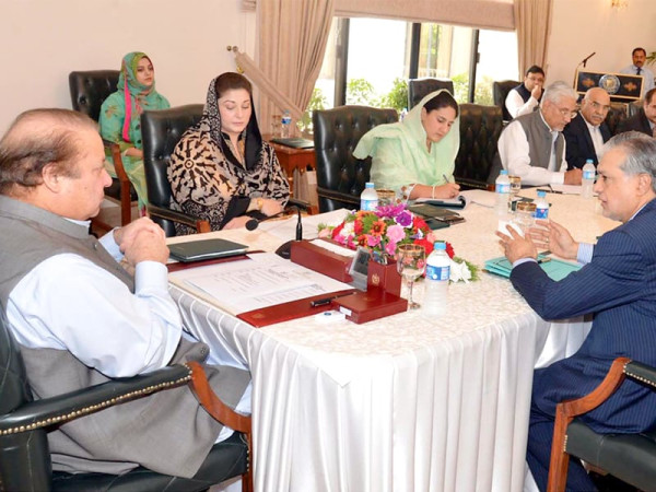 اسلام آباد:وزیراعظم نوازشریف کواسحق ڈاربریفنگ دے رہے ہیں،مریم نوازبھی موجودہیں۔ فوٹو: پی پی آئی