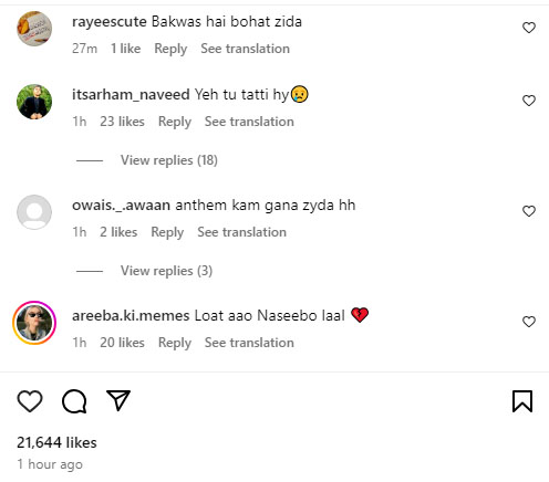 ترانے سے ناخوش ایک صارف نے کمنٹس سیکشن میں لکھا: 'لوٹ آؤ نصیبو لال'۔