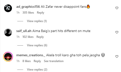 ایک اور صارف نے اپنے تبصرے میں کہا کہ: 'علی ظفر نے ایک بار پھر ثابت کردیا کہ کوئی انکو مات نہیں دے سکتا'۔
