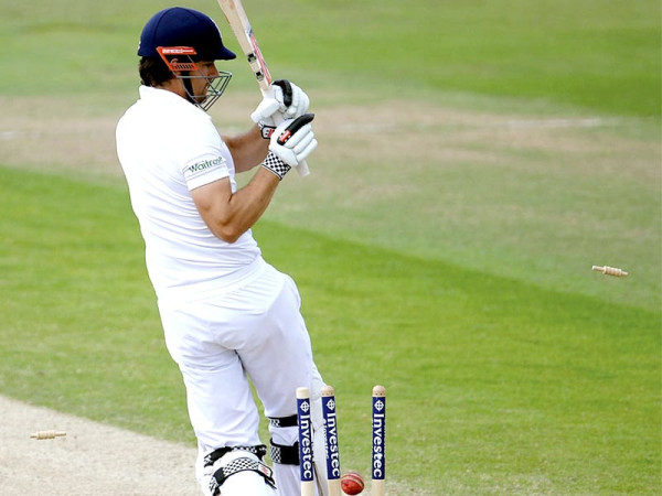 لیڈز ٹیسٹ کی دوسری اننگز میں انگلش کپتان الیسٹر کک کے بولڈ ہونے کا منظر ، وہ صرف 16رنز بناسکے۔ فوٹو: گیٹی امیجز