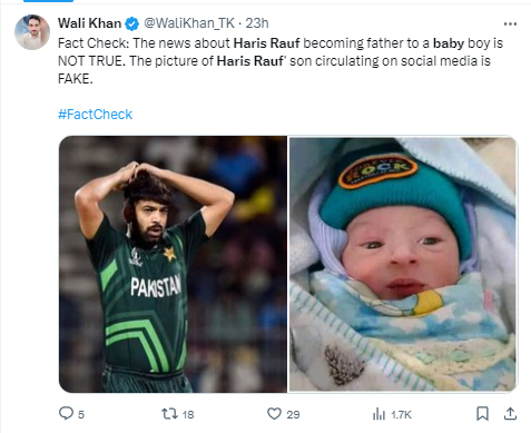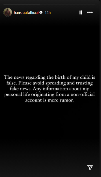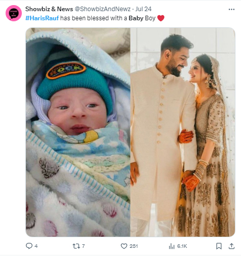 سوشل میڈیا سائٹ ایکس پر افواہ سامنے آئی تھی جس میں دعویٰ کیا گیا تھا کہ حارث رؤف اور مزنا مسعود کے ہاں پہلے بچے کی پیدائش ہوئی ہے جبکہ ایک نومولود بچے کی تصویر بھی شیئر کی گئی تھی۔