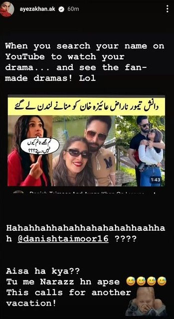 عائزہ خان نے اپنے آفیشل انسٹاگرام ہینڈل کی اسٹوری میں یوٹیوب ویڈیو کا اسکرین شاٹ شیئر کیا جس پر لکھا تھا کہ دانش تیمور ناراض عائزہ خان کو منانے کے لیے لندن لے گئے۔