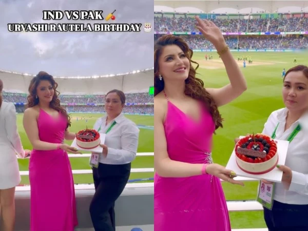 گلابی رنگ کے لباس میں ملبوس اروشی نے کیک پکڑا ہوا ہے جبکہ ساتھ میں ان کی اسٹاف ممبر بھی موجود ہیں۔ اداکارہ نے میچ کے دوران کیک کاٹا جس نے کرکٹ کے شائقین اور اداکارہ کے مداحوں کی توجہ سمیٹ لی۔