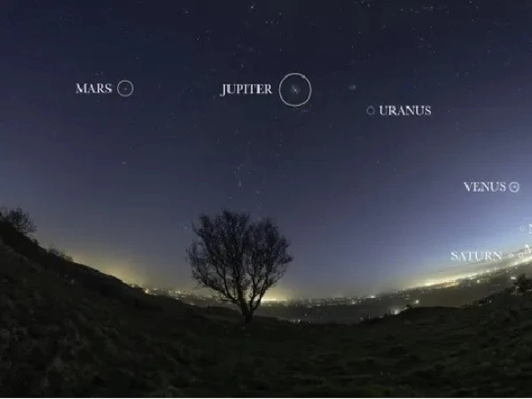 فلکیاتی فوٹوگرافر جوش ڈوری کی طرف سے کھینچی گئی تصویر میں مریخ، مشتری، یورینس، زحل، زہرہ، نیپچون اور مرکری کو ایک نایاب سیاروں کی پریڈ کی وجہ سے سیدھ میں دکھایا گیا ہے۔