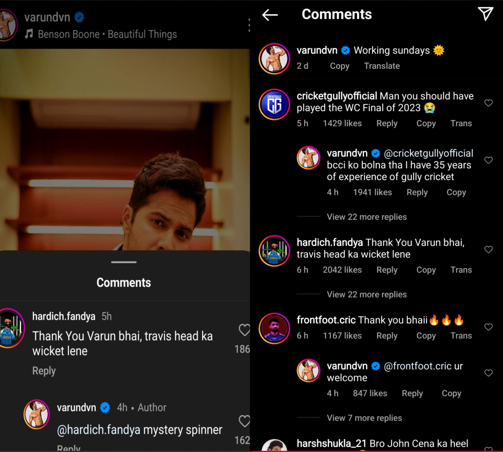 ایک مداح نے ورون دھون کو ٹیگ کرتے ہوئے لکھا، ’’ورون بھائی، ٹریوس ہیڈ کی وکٹ لینے پر بہت بہت شکریہ!‘‘ اس پر ورون دھون نے مزاحیہ انداز میں جواب دیا، ’’جادوئی اسپنر ہوں، کیا کریں!‘‘