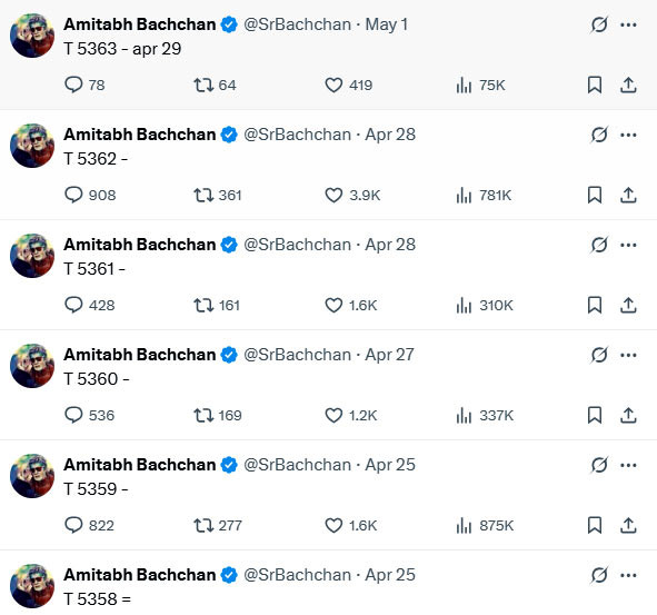 22 اپریل سے امیتابھ بچن کی ’ایکس‘ (سابقہ ٹوئٹر) پر پوسٹ ہونے والی ٹوئٹس میں صرف اتنا لکھا جارہا ہے: T 5356 - ، T 5357 -، اور یہ سلسلہ روز جاری ہے۔ جہاں پہلے وہ اپنی ہر ٹوئٹ میں کسی نہ کسی تجربے، واقعے یا جذباتی لمحے کو سمیٹتے تھے، اب ان کی تحریریں محض نمبروں تک محدود ہو گئی ہیں۔