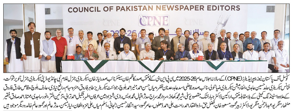 کونسل آف پاکستان نیوز پیپر ایڈیٹرز(سی پی این ای)کے سالانہ انتخابات برائے سال2025-26میں روزنامہ دنیا کے کاظم خان صدر اور ڈیلی پاک کے غلام نبی چانڈیو بلامقابلہ سیکریٹری جنرل منتخب ہوئے۔