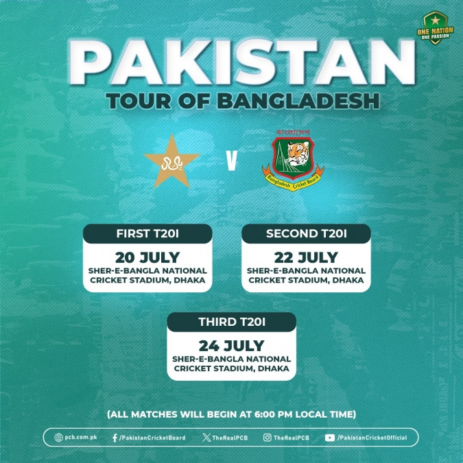 پاک بنگلادیش سیریز کا پہلا میچ 20 جولائی کو ڈھاکہ کے شیر بنگلہ نیشنل کرکٹ اسٹیڈیم میں کھیلا جائے گا، دوسرا میچ 22 اور سیریز کا تیسرا اور آخری میچ 24 جولائی کو ڈھاکا میں ہی شیڈول ہوگا۔