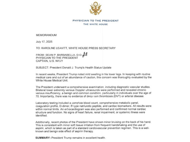 صدر ٹرمپ کی صحت سے متعلق تفصیلی میمو وائٹ ہاؤس کے معالج ڈاکٹر شان باربابیلا کی جانب سے جاری کیا گیا، جس میں اپریل میں ہونے والے سالانہ جسمانی معائنے کا حوالہ دیا گیا ہے۔ اس رپورٹ کے مطابق صدر اُس وقت بھی بہترین صحت میں تھے۔