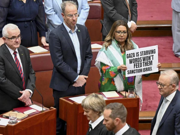 عالمی خبر رساں ادارے کے مطابق آسٹریلوی گرینز کی ڈپٹی لیڈر سینیٹر مہریں فاروقی نے اٹارنی جنرل سیم موسٹن کی تقریر کے دوران احتجاجاً پلے کارڈ اٹھایا ہوا تھا۔