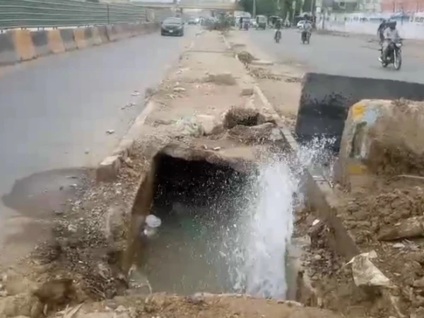گلشن اقبال بیت المکرم مسجد کے قریب نالے کی صفائی کے دوران ڈسٹری بیوشن کی 8 انچ پانی کی لائن پھٹ گئی۔