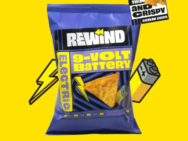 عالمی شہرت یافتہ چپس بنانے والا برانڈ Rewind نے حال ہی میں 9‑وولٹ بیٹری ذائقے والے کارن چپس لانچ کیے ہیں جس کا مقصد اس تجربے کو حقیقت میں تبدیل کرنا تھا جس میں لوگ بیٹری کو زبان لگاتے تھے اور اس کا تیز ذائقہ محسوس ہوتا تھا۔