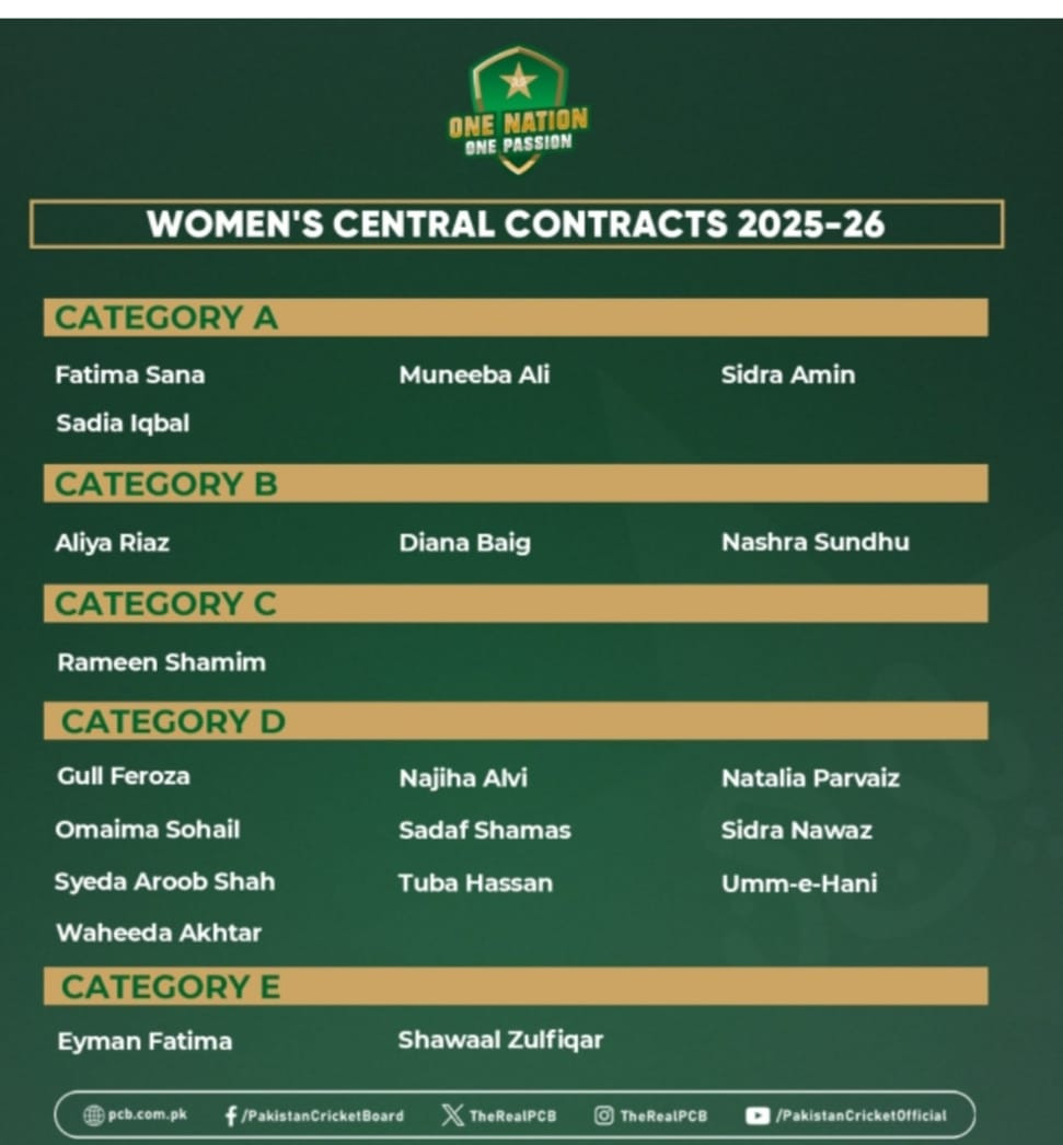 پی سی بی کے مطابق اے کیٹیگری میں فاطمہ ثنا، منیبہ علی، سدرہ امین اور آئی سی سی ٹی ٹوئنٹی رینکنگز کی نمبر ون بولر سعدیہ اقبال کو شامل کیا گیا ہے۔