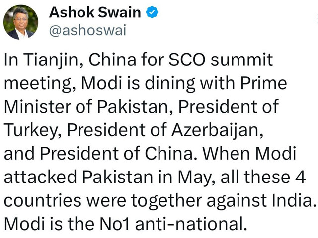 مودی نے تیانجن میں پاکستانی وزیراعظم، ترکیہ، آذربائیجان اور چین کے صدور کے ہمراہ کھانے میں شرکت کی۔ بھارتی سوشل میڈیا صارف کے مطابق پاک بھارت جنگ کے دوران یہ تینوں ممالک پاکستان کے ساتھ کھڑے رہے۔