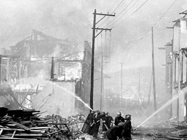 7جون 1941کو جنوب مغربی چین کے چھونگ چھنگ میں جاپانی فوج کی طرف سے کیے گئے فضائی حملوں کے بعد کی صورتِ حال۔ لوگ آگ بجھانے کی کوشش کر رہے ہیں۔ (شِنہوا-فائل فوٹو)