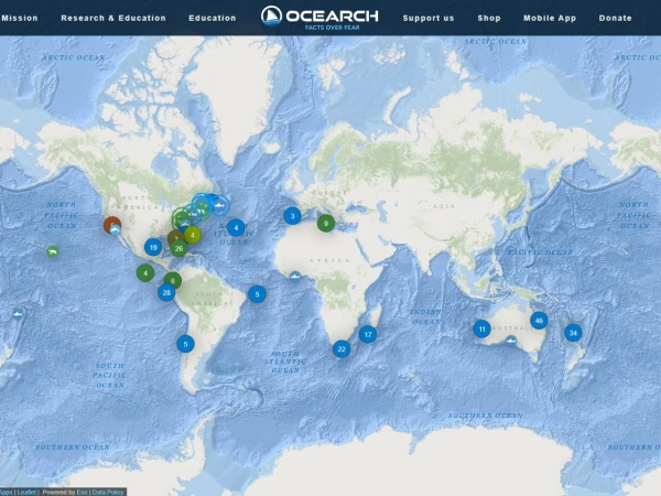 اوشیئرچ کا گلوبل شارک ٹریکر ویب-میپ اور موبائل ایپ آپ کو ہر ٹیگ شدہ شارک کی تازہ ترین لوکیشن، نام، نسل اور پروفائل دکھاتی ہے، بالکل نقشے پر پوائنٹس اور حرکت کی لائنوں کے ساتھ۔