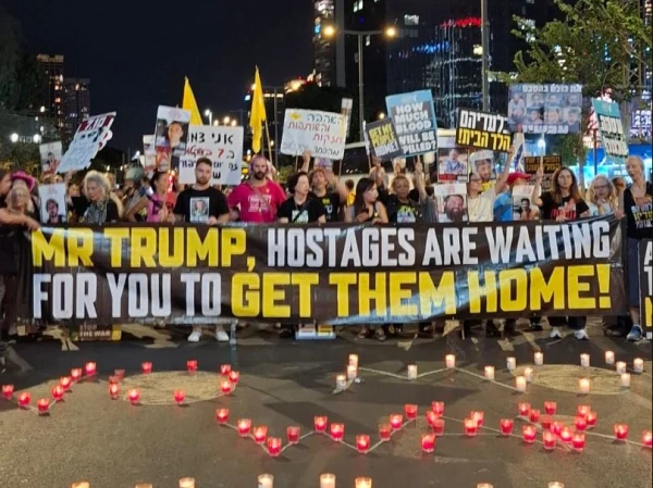 غیر ملکی میڈیا کے مطابق مظاہرین نے "ہاسٹیجز اسکوائر" پر جمع ہو کر نعرے بازی کی اور پلے کارڈز اٹھا رکھے تھے جن پر “جنگ بند کرو” اور “یرغمالیوں کو واپس لاؤ” جیسے نعرے درج تھے۔