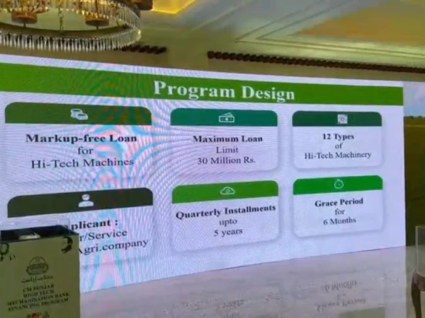 انہوں نے کہا کہ قرضوں کی ادائیگی کے لئے چھ ماہ کی رعایتی مدت بھی مقرر کی گئی ہے اور سہ ماہی بنیاد پر قرض کی اقساط پانچ سال میں ادا کرنی ہوگی۔ قرض کے لئے فارمر، سروس پروائیڈر اور ایگری کمپنی پورٹل کے ذریعے اپلائی کر سکتے ہیں۔ ہائی ٹیک زرعی مشینری کے مینوفیکچرنگ میں چین کی27، ترکی 10، اٹلی کی 5، جاپان، امریکا، برازیل، اسپین اور بیلا روس کی کمپنیاں شامل ہیں۔