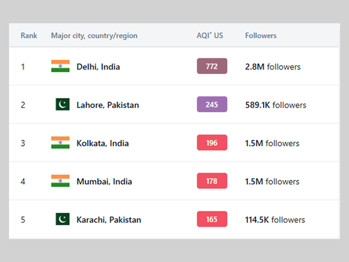بھارتی دارالحکومت نئی دہلی دنیا کے آلودہ ترین شہروں کی فہرست میں پہلے نمبر پر آگیا ہے جب کہ لاہور بھی اس وقت خطرناک آلودگی کی لپیٹ میں ہے۔